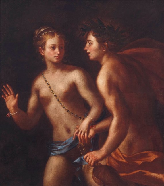 Negli antichi inventari dell'Istituto il soggetto viene identificato in Orfeoed Euridice, l'inversione però dei ruoli, lei che si volta a guardare lui, tenderebbe ad escludere questa indicazione, pur nell'aderenza degli attributi. In riferimento al tema trattato l'ipotesi più probante vede nelgiovane uomo il dio Apollo, in virtù degli attributi che lo accompagnano: la corona d'alloro sul capo e la lira da braccio nella mano sinistra. Egli, infatti, fu anche dio della poesia e della musica.
