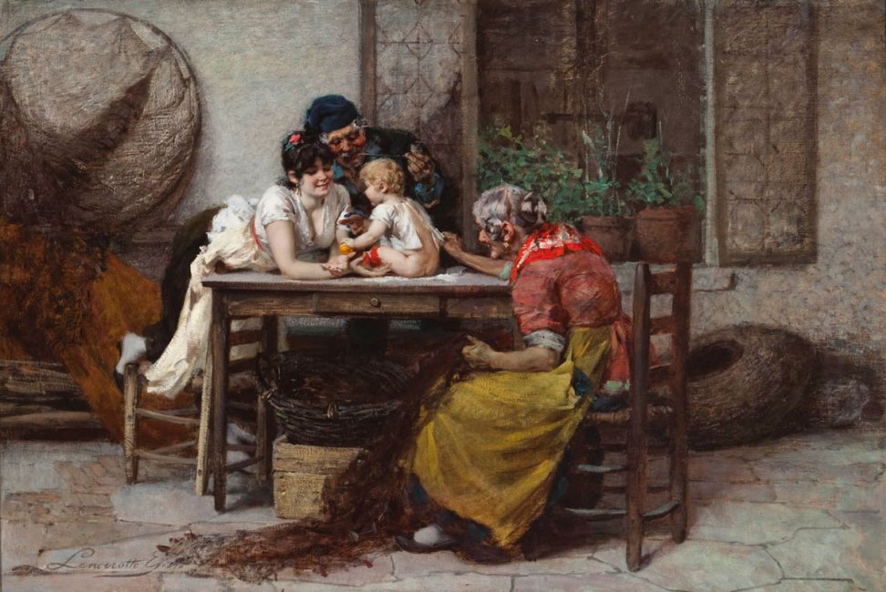 Lancerotto, non rinunciando a un bagaglio cromatico tipicamente alla veneta, che aveva in Giacomo Favretto e Luigi Nono due interpreti d'eccezione, aggredisce la tela con un vigore moderno, autentici graffi, segni ben visibili, per esempio, nella rete da pesca utilizzata quale elemento scenografico alle spalle dell'allegra scena che vede i due umili nonni giocare con il nipotino seduto sul tavolo dinanzi alla madre.