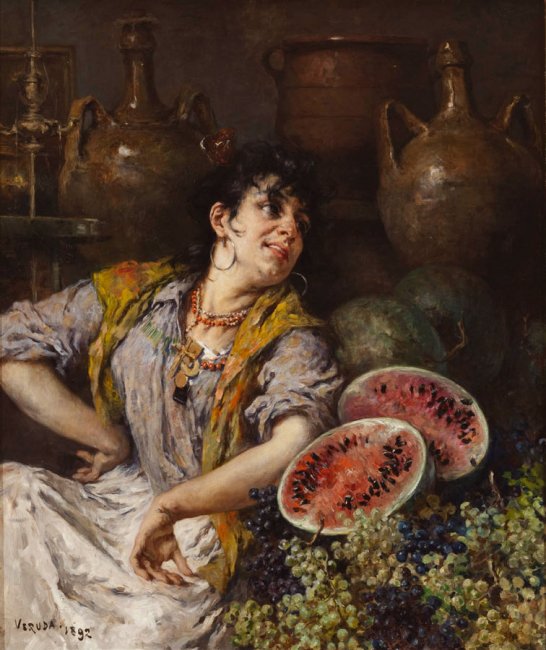 La Venditrice di frutta o Fruttivendola veneziana è uno degli esempi più felici nati dall'esuberante pennello di Umberto Veruda, in questo caso intriso di luminosa verità veneziana. L'opera, eseguita fra le lagune nell'estate del 1892 in parallelo al Garanghelo del Civico Museo Revoltella di Trieste, fu presentata dal pittore nell'autunno successivo, nell'unico asilo cittadino per gli artisti che volessero esporre in pubblico, ossia il negozio Schollian. Si trattava in verità di una “botteguccia d'antiquario e di decoratore”, ubicata “in quel primo tronco della via Roma, che si chiamava allora via Ponterosso”. Il lavoro fu valutato favorevolmente dalla critica, che evidenziò i progressi fatti dall'artista. Ricorda Silvio Benco, come la rivelazione dell'opera di Veruda fosse intesa nei circoli cittadini come una rivoluzione: “entrava con lui a Trieste l'impressionismo, sfondando bruscamente le porte: non si parlava che di lui, come non si è mai parlato in città di alcun altro pittore: e alle novità del suo modo di dipingere violento e scorretto, sorpassate le inesperienze con l'imperiosità dei toni aspri e con una tal quale freschezza irruente delle pennellate, il Veruda aggiungeva le stravaganze di un dandismo eccentrico, che nessuno osò «più mai imitare».