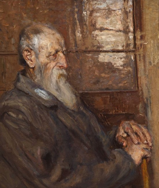 A uno dei primi momenti di questo “vigile riposo” triestino è riferibile il dipinto in esame, databile al 1887 circa. Esso risente, evidentemente, di quel realismo tedesco espresso in lingua impressionista da Max Liebermann, a cui il pittore triestino si legò “subito di durevole amicizia, sentendolo in qualche modo congeniale a se stesso”. Il Vecchio dell'Istituto dei poveri di Trieste attende a questa concezione dell'arte, che a Venezia si identificò nel cosiddetto verismo, il cuoi massimo esponente fu Giacomo Favretto, anch'egli fonte vitale di ispirazione per il pittore triestino. Si tratta di un vecchio, stanco e seduto, che trova appoggio alle proprie fatiche e alle proprie sofferenze nel bastone da passeggio. Il volto è arcigno, ma lo sguardo rimane fiero, penetrante.