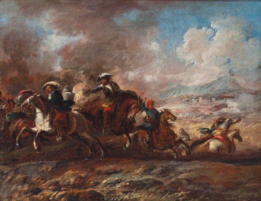 Gli artisti iniziarono così a sviluppare le potenzialità, essenzialmente decorative, di questo genere pittorico. Nel dipinto di collezione ITIS alcuni cavalieri dal cappello piumato affiorano dal gran polverone sollevato dalle rispettive armate, i cui combattenti sembrano sparire tra i fumi dei loro archibugi. Tale coltre fumosa e polverosa occlude in gran parte lo scorcio paesistico, lasciando in evidenza soltanto le rocce e il terriccio in primo piano.