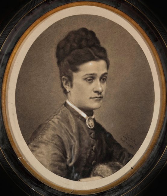 Il presente ritratto femminile potrebbe raffigurare Maria Covacevich (1844-1875), come sembra suggerire il confronto con il busto della stessa eseguito da Francesco Pezzicar e visibile nell'atrio dell'Istituto. Il disegno in oggetto rientra pienamente nella fase accademica veneziana del pittore e mostra chiaramente il livello qualitativo raggiunto a soli diciotto anni. Senza incertezze, con un gusto veristico già spontaneo, l'effigiata viene raffigurata di tre quarti e, nonostante la composizione si appoggi, con tutta probabilità, a un ritratto fotografico – l'effigiata morì giovanissima nel 1875 – Grünhut dimostra già una straordinaria padronanza del mestiere.