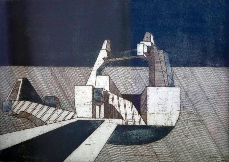 L'opera, donata dallo stesso Clamar all'ITIS, è un chiaro esempio della fase costruttivista dell'abile incisore. I suoi esordi, però, si registrano in tutt'altro campo. Dopo aver frequentato la Scuola del Nudo dell'Associazione Artistica Regionale a Trieste decise di muoversi a Venezia per imparare la soffiatura del vetro. E fu proprio Venezia, dopo aver seguito i corsi all'Accademia estiva di Salisburgo, a schiudergli il mondo dell'incisione alla Scuola Internazionale di Grafica. Dal 1975 iniziò una grande attività espositiva che lo portò ovunque, compresi gli Stati Uniti d'America. Grande parte della sua produzione ha avuto il tema suburbano industriale, trattato sempre con grande sensibilità e ricerca sperimentale della tecnica incisoria, qui di alienazione quasi cinematografica.