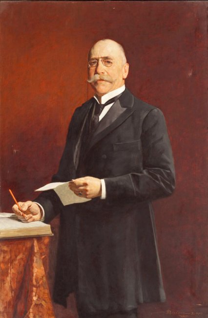 Giorgio Pitacco fu Sindaco di Trieste e Senatore del Regno d'Italia. La sua presidenza alla Direzione Generale di Pubblica Beneficenza cadde in un momento di particolare trasformazione per l'Istituto, conseguenza della crisi subentrata nell'immediato dopoguerra e delle incertezze burocratico-amministrative generate dall'annessione della città all'Italia. Pitacco dovette, giocoforza, sopprimere la vecchia Istituzione, ormai esautorata dai suoi compiti primari a seguito del R.D. del 22 aprile 1923, che estendeva alle nuove provincie la legislazione italiana sulla beneficenza pubblica, con la costituzione, anche a Trieste, della Congregazione di Carità, già esistente dal 1862 nelle altre città italiane. “Il 12 dicembre 1923 la Direzione Generale di Pubblica Beneficenza teneva la sua ultima riunione, nella quale il Sindaco dott. Pitacco prendeva congedo dai suoi collaboratori, passando le consegne al primo Presidente della Congregazione di Carità Carlo Banelli”. L'anno successivo il pittore Edgardo Sambo ricevette l'incaricato per l'esecuzione del suo ritratto. Dopo un iniziale tirocinio alla scuola di Giovanni Zangrando, dal 1900 al 1904, e i successivi soggiorni a Vienna e a Monaco, Sambo frequentò il “Corso del nudo e costume” istituito dal Circolo Artistico di Trieste che gli valse nel 910, per merito, un sussidio di studio conseguito insieme all'amico Argio Orell; l'anno successivo ottenne la borsa di studio