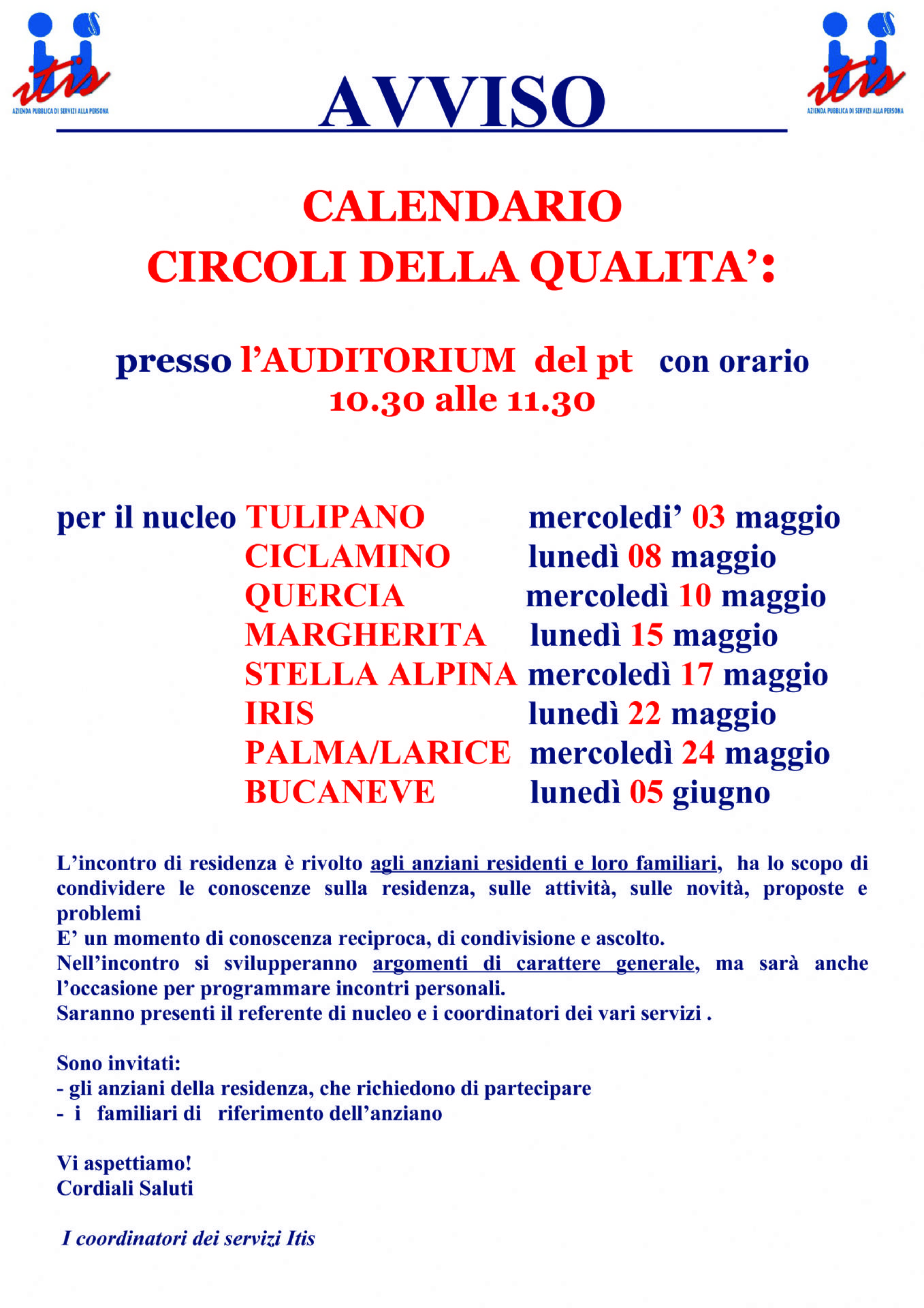 Ecco il calendario degli incontri del Circolo Qualità. L’incontro di residenza è rivolto agli anziani residenti e loro familiari, ha lo scopo di condividere le conoscenze sulla residenza, sulle attività, sulle novità, proposte e problemi. E’ un momento di conoscenza reciproca, di condivisione e ascolto. Nell’incontro si svilupperanno argomenti di carattere generale, ma sarà anche l’occasione per programmare incontri personali. Saranno presenti il referente di nucleo e i coordinatori dei vari servizi. Sono invitati: