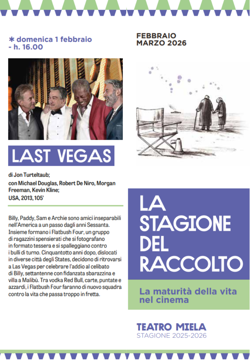 Il primo film de "La Stagione del Raccolto" che si tiene al Cinema Teatro Miela a partire da DOMENICA 1 Febbraio alle ore 16.00 è LAST VEGAS: Billy, Paddy, Sam e Archie sono amici inseparabili nell’America a un passo dagli anni Sessanta.