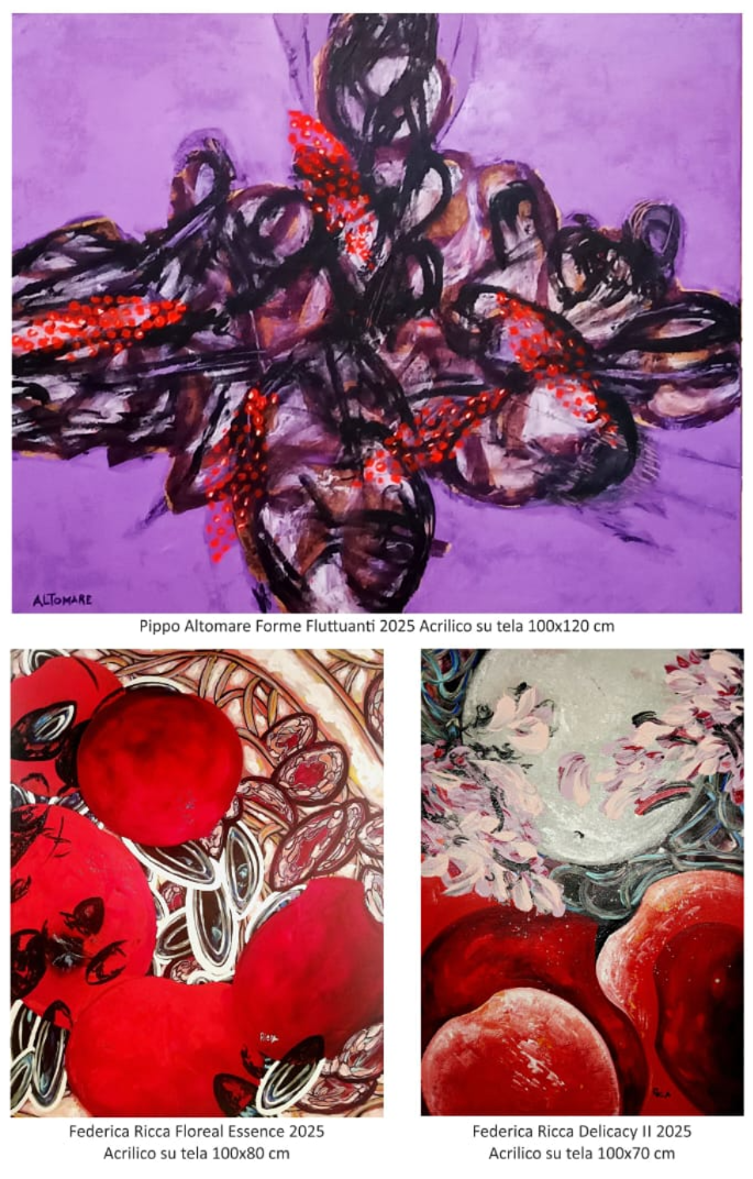 L’esposizione nasce dal dialogo tra due percorsi artistici autonomi che, pur mantenendo una forte identità individuale, trovano nel confronto una crescita reciproca. Le opere mettono in scena un raffinato gioco dialettico di segni, luci e colori: per Altomare, forme vegetali e floreali emergono con forza iconica da superfici vibranti, aprendo a un “altrove” luminoso e contemplativo; per Ricca, una pittura attenta al dettaglio e alla musicalità compositiva trasforma emozioni e stati d’animo in immagini simboliche, attraverso linee, geometrie e cromie reinventate.
