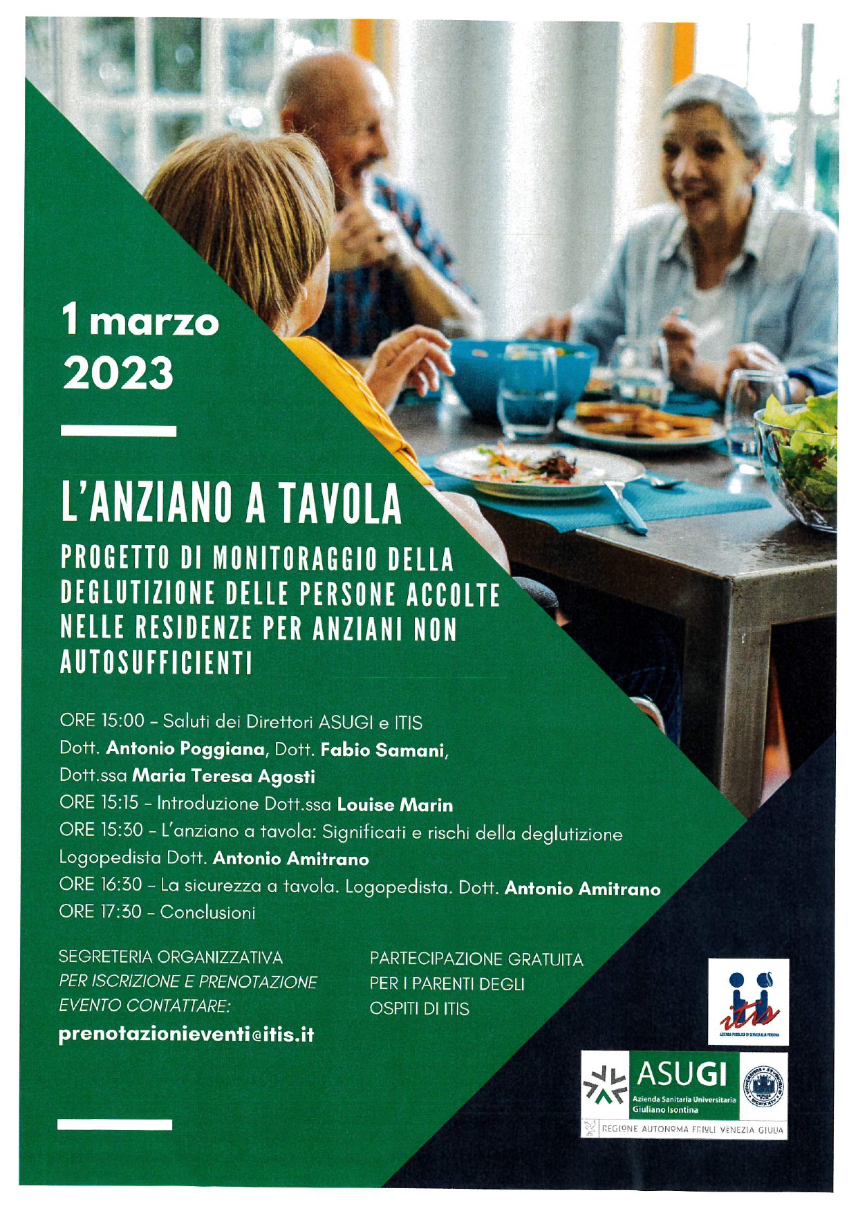 Mercoledì 1 marzo alle ore 15:00 nella sala auditorium dell'A.S.P. ITIS si svolgerà un incontro promosso da ASUGI per la presentazione di un progetto di monitoraggio della deglutizione delle persone accolte nelle residenze per anziani non autosufficienti dal titolo "L'anziano a tavola".
