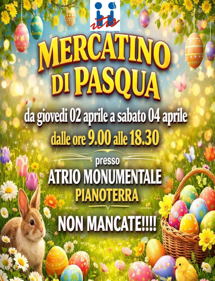 Da giovedì 2 aprile a sabato 4 aprile, dalle 9.00 alle 18.30, l’atrio monumentale al piano terra dell’ITIS si animerà con il tradizionale mercatino di Pasqua. Un’occasione per immergersi in un’atmosfera festosa tra colori, creatività e tante idee regalo, realizzate con cura e passione.