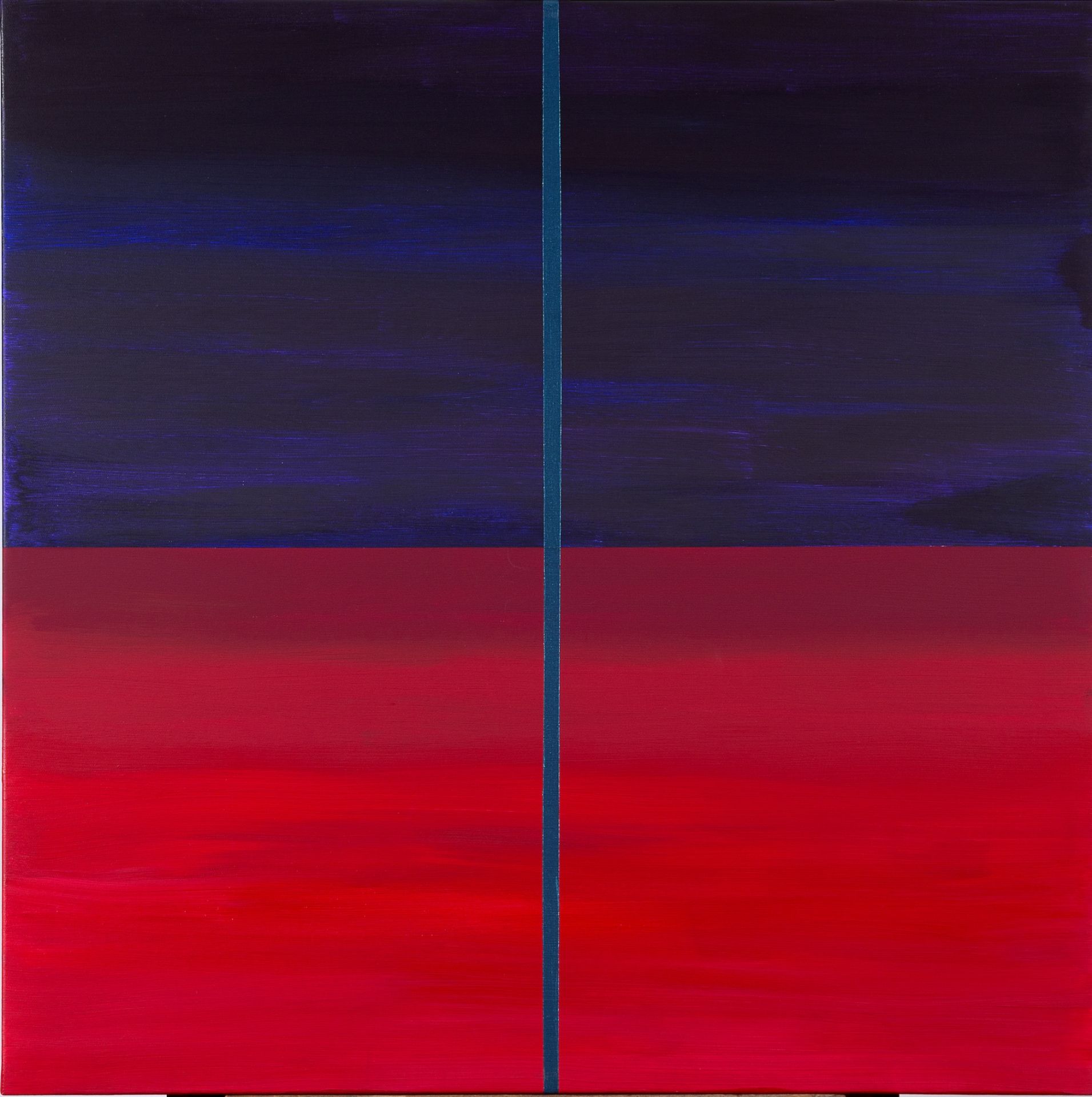 La prima nota di evidente intreccio di storie tra i cicli pittorici qui esposti è la sottrazione che si sviluppa nel processo costruttivo di ogni singolo dipinto (una sottrazione che non nega la complessità, ma che vi aderisce nella somma di segni minimali e nella costante del numero tre (tre i colori impiegati in ogni opera, tre le campiture nelle quali detti colori si affermano); la seconda è la pacatezza di queste geometrie (le cui stesure sono tutte dipinte ad acrilico); la terza è la luce come punto di riferimento primario (e non solo relativa a una fonte luministica esterna, ma soprattutto a una luce intrinsecamente interiore o simbolicamente generata dall’opera); la quarta è la dominante cromatica che si manifesta in contrasti forti e decisi; la quinta è l’evocazione indiretta o fatta scaturire dall’interno della campitura. I punti di riferimento, o modelli culturali, vanno rintracciati nel silenzio della pittura di Edward Hopper e nelle sequenze cromatiche di Mark Rothko: ambedue questi autori ci riferiscono di una solitudine esistenziale e di una sconfitta dell’illusione realista.