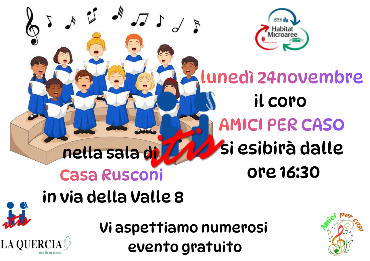 Lunedì 24 novembre, nella sala di Casa Rusconi in via della Valle 8, si terrà un appuntamento musicale realizzato grazie alla collaborazione tra Habitat Microaree, Cooperativa Sociale La Quercia Onlus, ASP ITIS e l’associazione Coro Amici per Caso. A partire dalle 16.30, il Coro Amici per Caso si esibirà con un repertorio coinvolgente, pensato per regalare un pomeriggio di armonia e buonumore a tutti i partecipanti. L’ingresso è gratuito e l’invito è aperto a chiunque desideri condividere un momento di musica e convivialità. Vi aspettiamo numerosi!