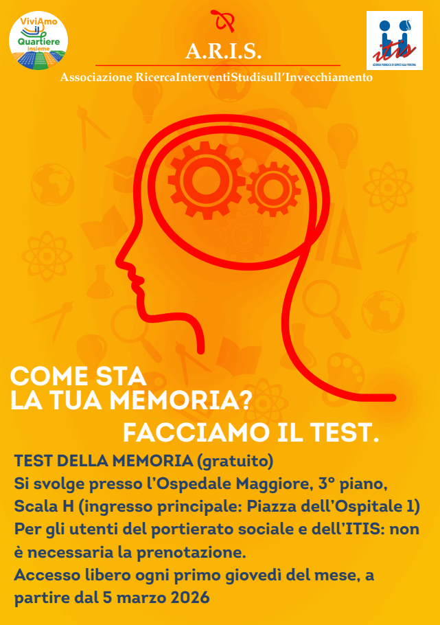 Nell'ambito delle attività del Portierato Sociale ogni primo giovedì del mese è possibile effettuare il test gratuito della memoria senza prenotazione presso l’Ospedale Maggiore (3° piano, scala H, Centro per l’anziano), a cura di ARIS, per verificare il proprio stato cognitivo.