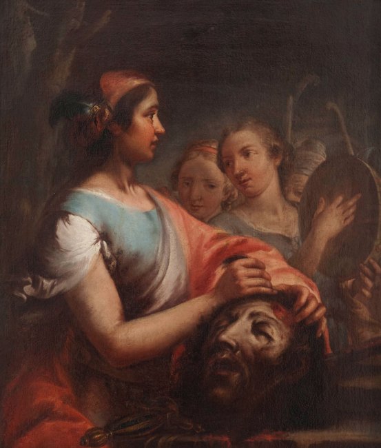La buona qualità del dipinto tradisce l’intervento di un maestro da indivuare, è pensabile, nel pittore veneziano Giuseppe Nogari. La vicenda artistica di Nogari si sviluppò in diversi centri italiani, da Venezia a Torino, passando per Milano. In questo dipinto, ben congegnato appare il silente gioco di sguardi che porta la fanciulla con tamburello a interrogare l’eroina, mentre la sua compagna tenta un dialogo esterno con l’osservatore. La cifra stilistica risulta fragrante nella scelta cromatica e nella resa del mantello, della veste e degli incarnati di Giuditta; più streotipata, sulla base di modelli consolidati, la costruzione delle teste di fondo, che trovano un corrispettivo in quei gruppi allegorici dipinti dall’artista, a guisa di sopraporte, nella biblioteca della Palazzina di Stupinigi a Torino.
