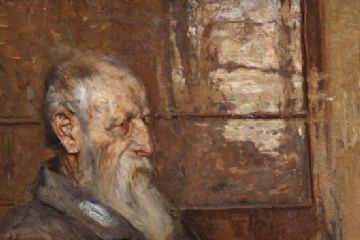 A uno dei primi momenti di questo “vigile riposo” triestino è riferibile il dipinto in esame, databile al 1887 circa. Esso risente, evidentemente, di quel realismo tedesco espresso in lingua impressionista da Max Liebermann, a cui il pittore triestino si legò “subito di durevole amicizia, sentendolo in qualche modo congeniale a se stesso”. Il Vecchio dell'Istituto dei poveri di Trieste attende a questa concezione dell'arte, che a Venezia si identificò nel cosiddetto verismo, il cuoi massimo esponente fu Giacomo Favretto, anch'egli fonte vitale di ispirazione per il pittore triestino. Si tratta di un vecchio, stanco e seduto, che trova appoggio alle proprie fatiche e alle proprie sofferenze nel bastone da passeggio. Il volto è arcigno, ma lo sguardo rimane fiero, penetrante.