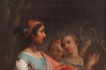 Il dipinto riprende il celebre episodio vetero testamentario di Giuditta, l’eroina che riuscì a sventare l’assedio assiro alla città ebraica di Betulia. La donna, bella e attraente, dopo esser stata ammessa al campo nemico, riuscì ad attirare le attenzioni del generale assiro Oloferne, il quale invaghitosi della donna acconsentì, in chiusura di un banchetto, di rimaner da solo con lei. Le cospicue libagioni assaporate durante la festa non gli permisero però di opporre la necessaria resistenza allorquando la donna, sguaiata la spada, gli recise con colpo secco il capo. La notizia della morte del loro condottiero gettò lo scompiglio tra gli assiri che fuggirono inseguiti dagli israeliti. L’episodio qui raffigurato riprende il momento successivo, quando la bella eroina rientra in città con, a guisa di trofeo da ostentare, la testa mozzata del generale assiro: l’allusione alla decapitazione permane nell’elegante elsa della spada, ancora insanguinata, che si scorge sotto il capo di Oloferne; contestualmente, le fanciulle d’Israele, con tamburello e cimbali, la circondano festeggiandola.